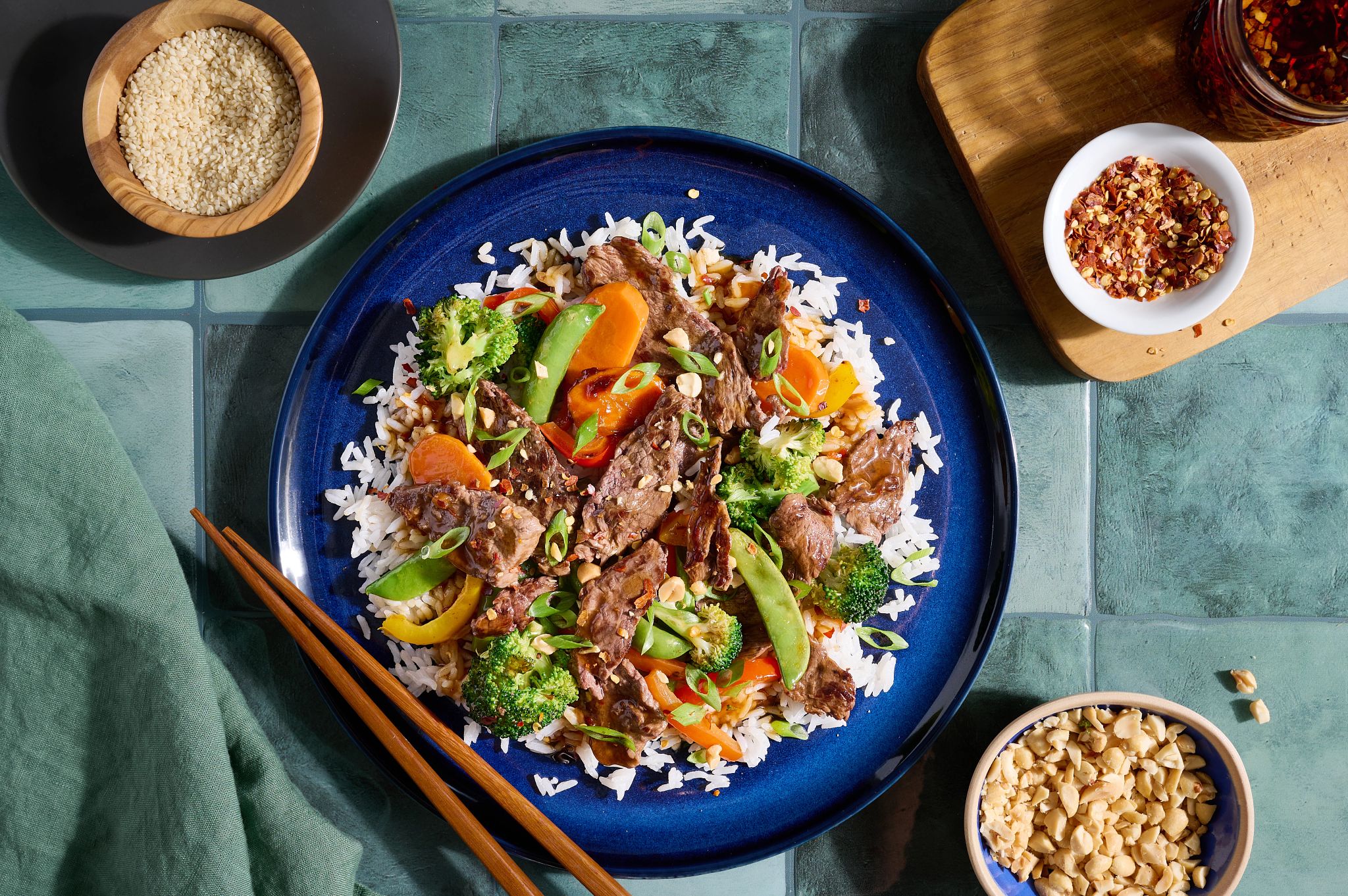 - Return all beef and vegetables to pan. Add stir-fry sauce and crushed red pepper; heat through. Serve over rice. Sprinkle with peanuts, if desired.